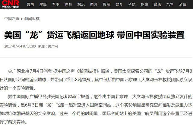 據中國之聲《新聞縱橫》報道,美國太空探索公司的“龍”貨運飛船7月3日從國際空間站返回地球,并帶回了約1.8噸物資,其中包括由中國北京理工大學鄧玉林教授團隊獨立設計的一個實驗裝置。