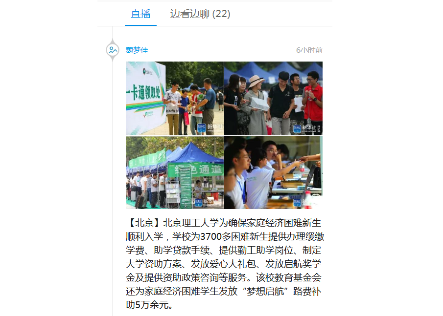 北京理工大學為確保家庭經濟困難新生順利入學,學校為3700多困難新生提供辦理緩繳學費、助學貸款手續、提供勤工助學崗位、制定大學資助方案、發放愛心大禮包、發放啟航獎學金及提供資助政策咨詢等服務。該校教育基金會還為家庭經濟困難學生發放“夢想啟航”路費補助5萬余元。
