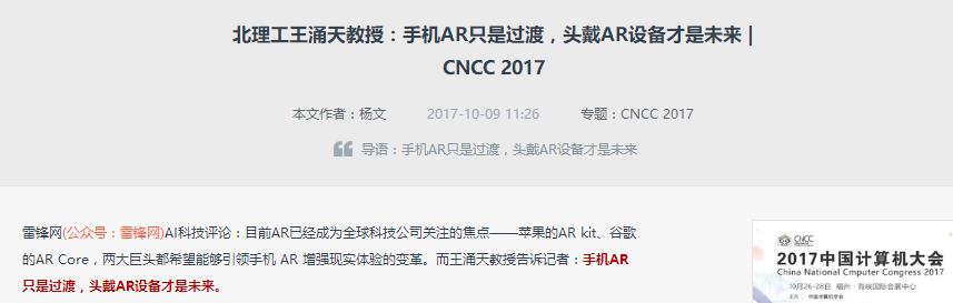 作為CNCC 2017 的特邀講者之一的王涌天教授這次已是第三次參加CNCC大會(huì),他主要研究的增強(qiáng)現(xiàn)實(shí)(AR)技術(shù)目前在國(guó)際上異常火熱。