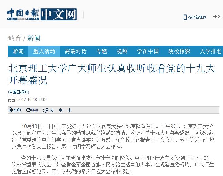 【中國日報】北京理工大學廣大師生認真收聽收看黨的十九大開幕盛況
