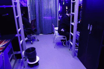 “我們的整體設計是一個太空艙。”鄧亞東說,他打開27日晚上拍的照片,宿舍四個同學都坐在自己的座位上,房頂中央的白熾燈被關上,從床邊和房頂四周延伸過去的LED燈帶閃著藍色的光,從門口看去,確實像是進了一個微型艙內。