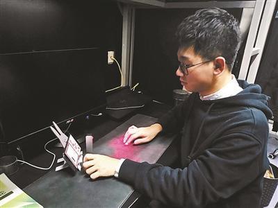 宿舍的宋善臺正在座位上修改論文,由于論文需要在15:30之前交,宋善臺特意從外邊趕回來,做最后的修改。北青報記者走近一看,他沒有開電腦,而是用手指在桌子上敲打文字。原來,他使用了“投影鍵盤”,打開這個工具,桌子上就會投出一個像鍵盤一樣的影子,在桌子的鍵盤上打字,通過藍牙,打好的字就可以顯示在手機屏幕上,文章修改完直接通過手機發到老師郵箱。“著急的時候就不用再等待電腦開機了。”宋善臺告訴北青報記者,如果早晨交論文的話,還可以把鍵盤“投”在床桌上,這樣“不出被窩也能提交”。“基本上桌子就可以代替電腦。”宋善臺說。