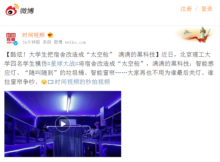 【微博·時間視頻】北理工大學生把宿舍改造成“太空艙” 滿滿的黑科技