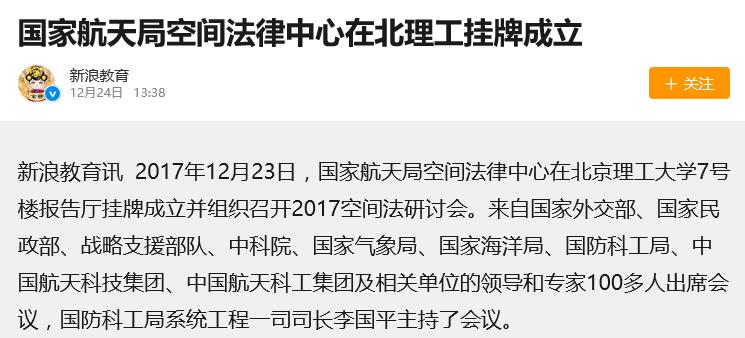 【新浪教育】國家航天局空間法律中心在北理工掛牌成立