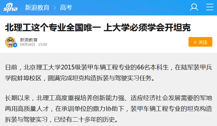 【新浪網】北理工這個專業全國唯一 上大學必須學會開坦克