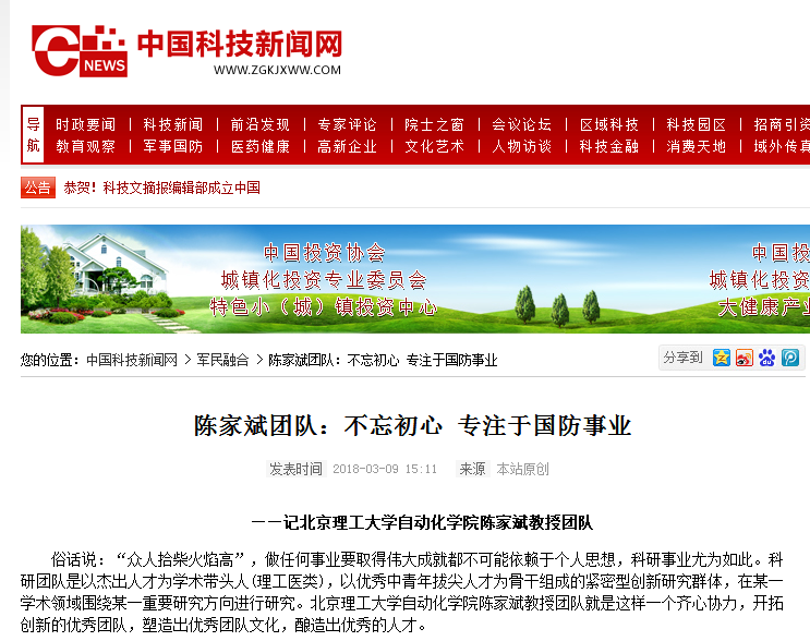 【中國科技新聞網】北理工陳家斌團隊:不忘初心 專注于國防事業