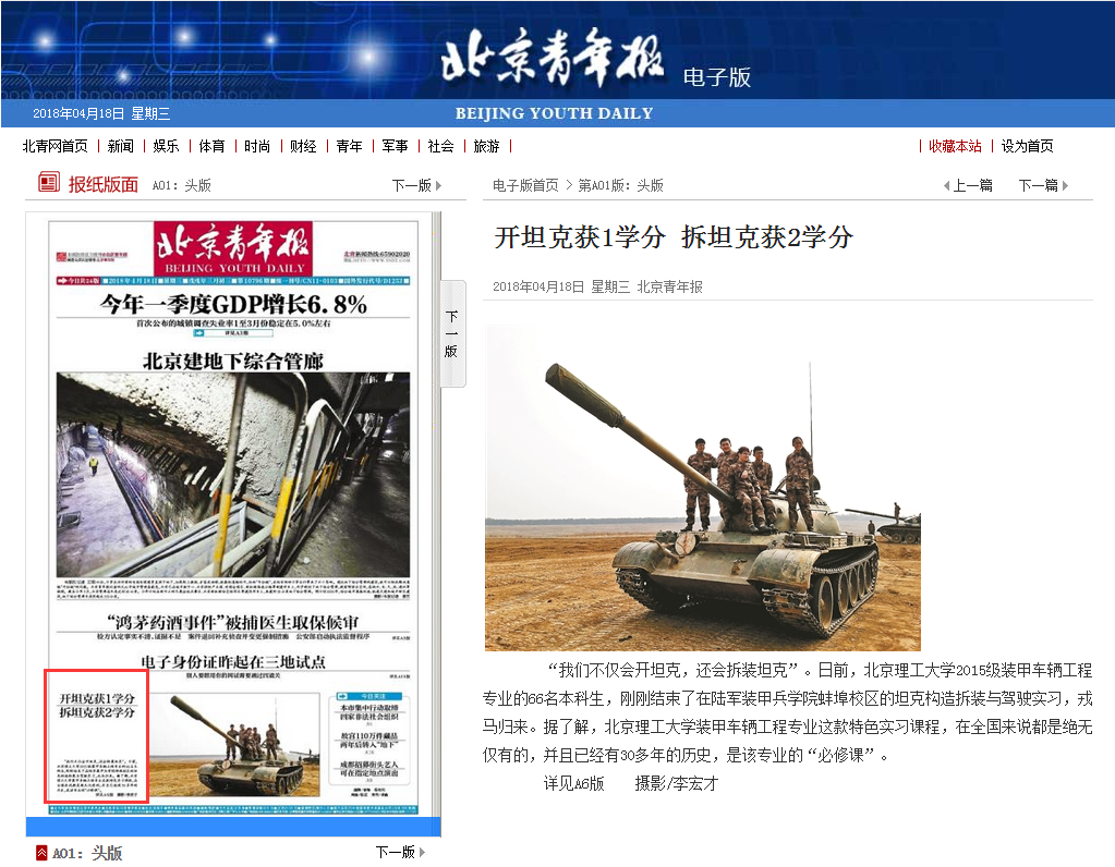 【北京青年報·頭版】北理工:開坦克獲1學分 拆坦克獲2學分