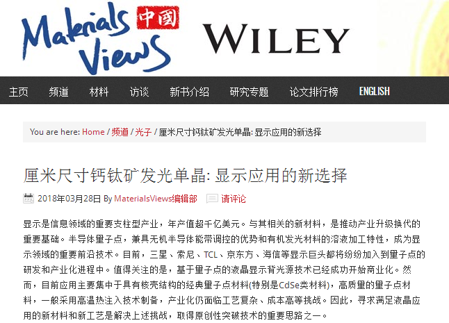 【Materials Views】北理工鐘海政課題組:厘米尺寸鈣鈦礦發光單晶—— 顯示應用的新選擇