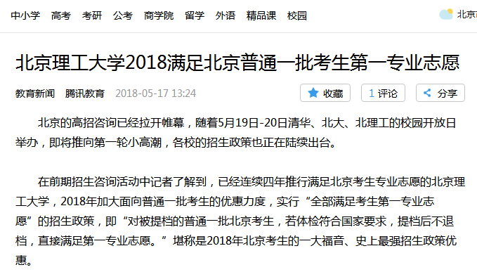 【騰訊網】北理工2018年實行“全部滿足考生第一專業志愿”的招生政策