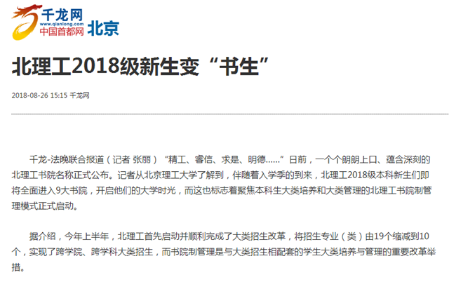 據(jù)介紹,今年上半年,北理工首先啟動(dòng)并順利完成了大類(lèi)招生改革,將招生專(zhuān)業(yè)(類(lèi))由19個(gè)縮減到10個(gè),實(shí)現(xiàn)了跨學(xué)院、跨學(xué)科大類(lèi)招生,而書(shū)院制管理是與大類(lèi)招生相配套的學(xué)生大類(lèi)培養(yǎng)與管理的重要改革舉措。