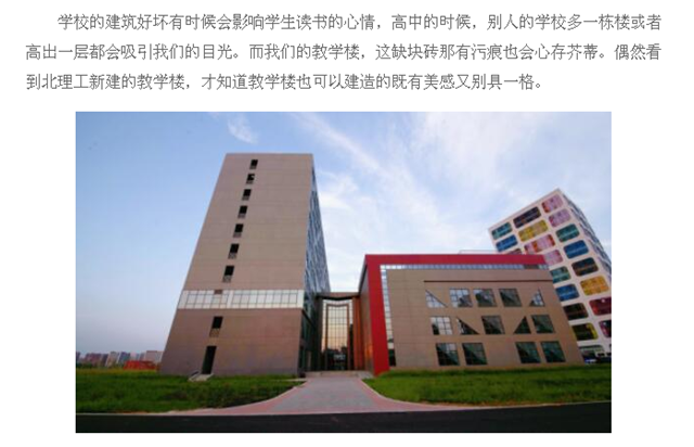 學校的建筑好壞有時候會影響學生讀書的心情,高中的時候,別人的學校多一棟樓或者高出一層都會吸引我們的目光。而我們的教學樓,這缺塊磚那有污痕也會心存芥蒂。偶然看到北理工新建的教學樓,才知道教學樓也可以建造的既有美感又別具一格。