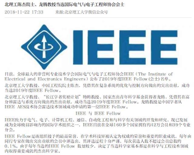 【北京日報客戶端】北理工陳杰院士、龍騰教授當選國際電氣與電子工程師協會會士