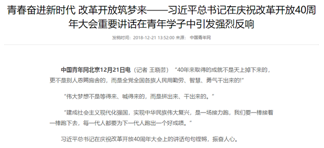 【中國(guó)青年網(wǎng)】青春奮進(jìn)新時(shí)代 改革開(kāi)放筑夢(mèng)來(lái)——習(xí)近平總書(shū)記在慶祝改革開(kāi)放40周年大會(huì)重要講話在青年學(xué)子中引發(fā)強(qiáng)烈反響