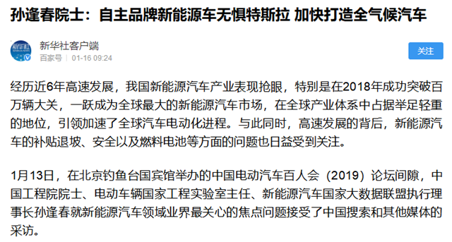 1月13日,在北京釣魚臺國賓館舉辦的中國電動汽車百人會(2019)論壇間隙,中國工程院院士、電動車輛國家工程實驗室主任、新能源汽車國家大數據聯盟執行理事長孫逢春就新能源汽車領域業界最關心的焦點問題接受了中國搜索和其他媒體的采訪。