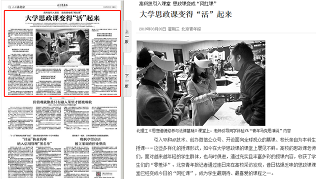 “虛擬現(xiàn)實(shí)、增強(qiáng)現(xiàn)實(shí)技術(shù)的出現(xiàn)使得教學(xué)手段更科學(xué)化、更高效、更豐富多彩,能提供直觀的、形象的多重感官刺激的視聽覺材料。”北京理工大學(xué)馬克思主義學(xué)院院長李林英告訴北青報(bào)記者,虛擬技術(shù)讓學(xué)生觀察到在現(xiàn)實(shí)生活中不能觀察到的事物,實(shí)現(xiàn)“線上與線下互聯(lián)”,讓思政課變得更印象深刻。