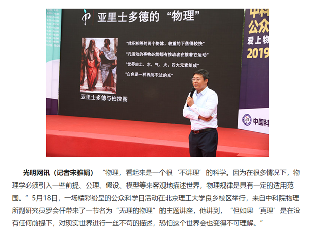 “物理,看起來是一個很‘不講理’的科學(xué)。因為在很多情況下,物理學(xué)必須引入一些前提、公理、假設(shè)、模型等來客觀地描述世界,物理規(guī)律是具有一定的適用范圍。”5月18日,一場精彩紛呈的公眾科學(xué)日活動在北京理工大學(xué)良鄉(xiāng)校區(qū)舉行,來自中科院物理所副研究員羅會仟帶來了一節(jié)名為“無理的物理”的主題講座,他講到,“但如果‘真理’是在沒有任何前提下,對現(xiàn)實世界進(jìn)行一絲不茍的描述,恐怕這個世界會也變得不可理解。”