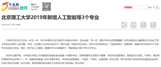 【千龍網】北京理工大學2019年新增人工智能等3個專業