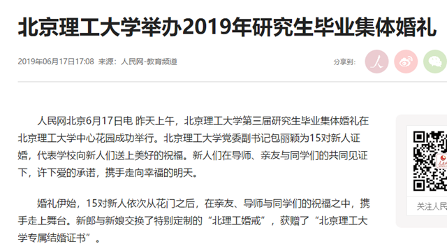 【人民網】北京理工大學舉辦2019年研究生畢業集體婚禮