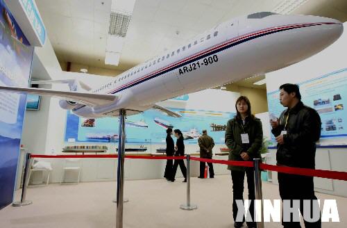 1月11日,參觀者在科技創(chuàng)新重大成就展上觀看由中國航空工業(yè)第一集團研制的ARJ21-900型支線客機,這款飛機將于2008年投放市場。科技創(chuàng)新重大成就展近日在北京舉行,該展以增強自主創(chuàng)新能力為主線,展出了480余項重大科技成果和800余件實物、模型。 新華社記者李明放攝