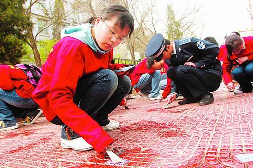 北京理工大學的學生們每周周日堅持與城市管理監察大隊一起義務鏟除街頭違法小廣告,將街道清理作為學生實踐“榮辱觀”的一項長期社會服務項目,以實際行動喚起市民對綠色街道文明的關注。
