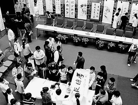 5月27日,首都大學(xué)生“新風(fēng)尚”書(shū)法繪畫(huà)聯(lián)展在北京理工大學(xué)舉行。展覽吸引了北京二十多所高校大學(xué)生的積極參與,共征集作品280余幅。大學(xué)生們以書(shū)畫(huà)藝術(shù)形式充分展示了自己的精神風(fēng)貌和道德新風(fēng)尚。圖為聯(lián)展筆會(huì)現(xiàn)場(chǎng)。
