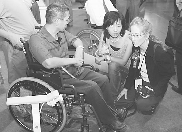 美國無障礙設計專家正在與殘障人士交談。日前在北京科學技術委員會與北京理工大學共同主辦的第一屆無障礙設計國際學術研討會上,來自美國、德國、日本、阿根廷、印度及國內的多位無障礙設計專家、學者就各國殘疾人住宅、老年人生活用品、公共建筑、交通工具等無障礙設施設計進行探討論證,對把世界最先進的無障礙設計概念引入中國城市建設起到推動作用。
