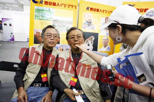 西安超人雕塑研究院展臺吸引了眾多的觀眾,展出的機器人是參照研究院鄒人倜院長的模樣設計的,真假鄒人倜的身高、發型、服飾,甚至連皺紋和老年斑都一模一樣。當鄒人倜與機器人坐到一起時,即使近在咫尺的觀眾也分不清真假。