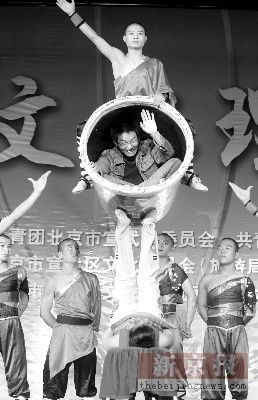 昨日,北京理工大學(xué)體育館,女演員把一學(xué)生裝進(jìn)大缸中蹬起并轉(zhuǎn)動。當(dāng)日,“宣南文化理工行”文藝晚會上演,天橋絕活抖空竹、耍中幡、蹬大缸等民間絕藝獲得了多名師生的熱烈掌聲。
