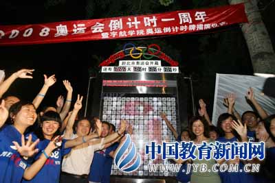 8月8日,北京理工大學(xué)舉行了“歡慶2008奧運(yùn)會(huì)倒計(jì)時(shí)一周年大會(huì)暨宇航科學(xué)技術(shù)學(xué)院奧運(yùn)倒計(jì)時(shí)牌揭牌儀式”,來自各學(xué)院的100多名奧運(yùn)志愿者骨干代表在奧運(yùn)五環(huán)下進(jìn)行了宣誓,表達(dá)了他們對(duì)北京2008年奧運(yùn)會(huì)的期盼和祝愿。