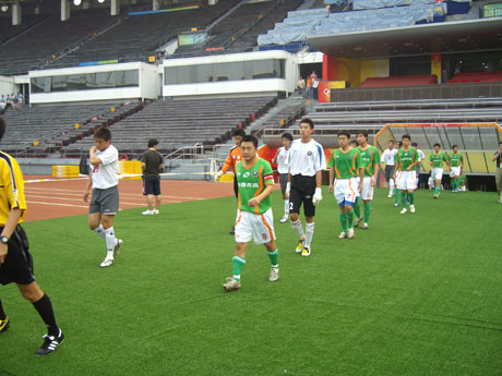 上星期六,北京兩支中甲球隊,北京理工大學和北京宏登,應北京市足協的邀請,來到奧運會足球比賽賽場之一工人體育場進行一場模擬比賽。