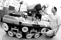 “這是新型多用途反恐防暴機器人,最大速度為72米/分鐘,可一次攜帶23枚催淚彈……”北京理工大學機電工程系大四學生楊成偉滔滔不絕地向觀眾們介紹著,這臺形似微縮裝甲車的機器人成本只有五六萬元,基本功能和結構原理抵得上百萬元的進口貨。據悉,該項目在去年教育部“國家大學生創新計劃”展示會中奪得 “我最喜愛的十個項目”之冠。
