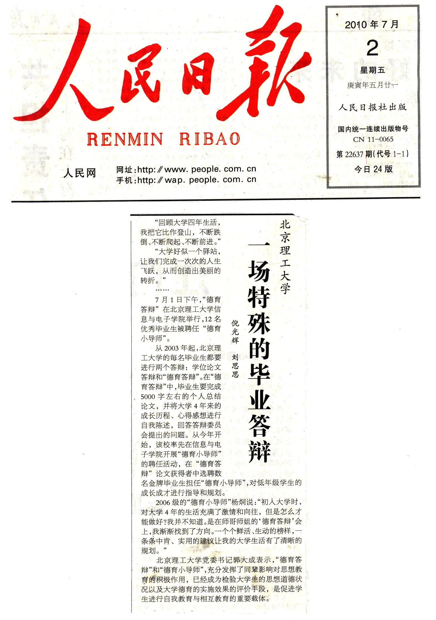 【編輯的話】長期以來,我校不斷創新思想政治教育載體,探索完善大學德育體系的新思路和新方法,創立的德育答辯制度以其創新性、針對性和實效性獲得了2004—2005年北京高等學校黨的建設和思想政治工作創新成果獎。2007年8月,李長春等中央領導同志對我校德育答辯工作給予了充分肯定并作做出了重要批示。為貫徹落實5月29日至30日召開的全國加強和改進大學生思想政治教育工作座談會精神,我校從今年開始率先在信息與電子學院建立“德育小導師”制度,在“德育答辯”論文獲得者中選聘數名金牌畢業生擔任“德育小導師”,對低年級學生的成長成才進行指導和規劃。中央電視臺、新華社、中國新聞社、人民日報、光明日報、中國青年報、北京日報等多家媒體應邀對我校德育答辯工作的新做法進行了采訪報道。現予轉發《人民日報》7月2日刊載的《北京理工大學:一場特殊的畢業答辯》一文。