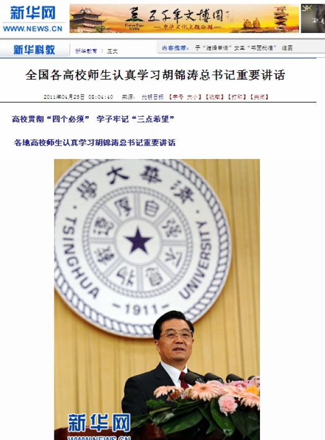 4月25日出版的《光明日報》頭版以《高校貫徹“四個必須” 學子牢記“三點希望”——各地高校師生認真學習胡錦濤總書記重要講話》為題,報道了北京理工大學黨委書記郭大成、馬克思主義理論教研部教師王娟、基礎教育學院大一學生李春林對胡錦濤總書記在清華大學建校100周年慶祝大會上重要講話的學習心得和感悟。報道如下: