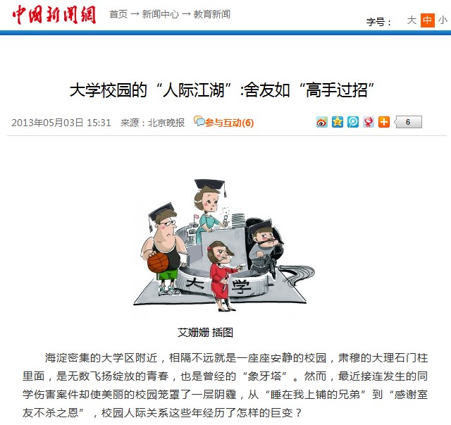 【中國新聞網】大學校園的“人際江湖”:舍友如“高手過招”