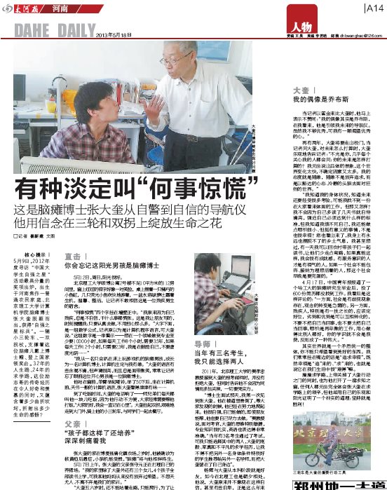 “博士生面試那天,我第一次見到張大奎。他在樓道里滑倒了,等大家發現的時候,他已經在努力地爬起來。他很自強,自己能做的,即使朋友能幫,他也要自己盡力去做。”樊教授說,面對考官,大奎的思維特別敏捷,專業知識很扎實,英語也表達得非常準確, “當年有3名考生通過了考試,可我只能選擇其中的兩人,大奎的剛毅、率真和不平凡的求學經歷,讓我不得不把另外一名身體條件特別好的學生推薦給另外一名導師,而把大奎留在了自己身邊”。