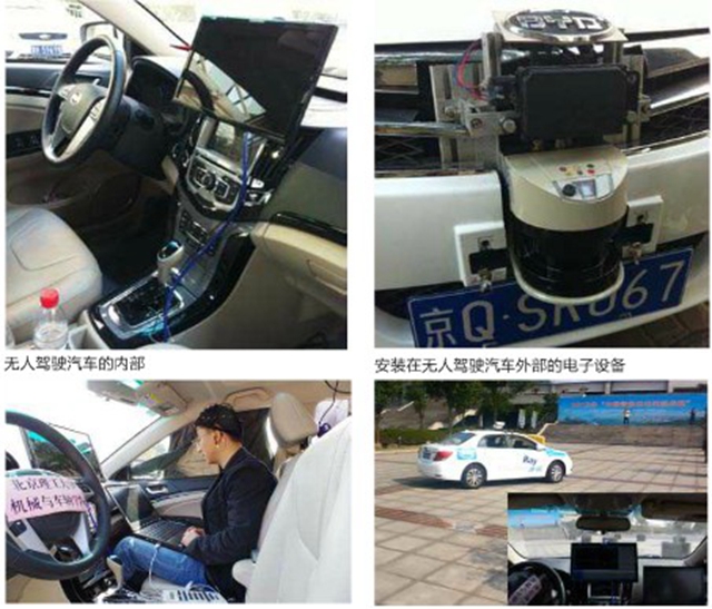 在出發點,參賽的車輛車型各異,因各研發機構控制的方法不同,因此車的裝備也很不一樣。有的車上還有和機械手一樣的自動駕駛儀,有多個外接電機。北理工車隊有三輛車參賽,其中“RAY”顯得最清爽,從外觀看,只在車頂有一攝像頭,車前裝有激光雷達和毫米波雷達,車身就是從4S店買來的比亞迪汽車。車內駕駛座旁的顯示屏是給研發人員查看車況的,中控系統放在后排椅子下,電腦主機在后備箱。駕駛座、方向盤與我們平常車一樣沒有外接設備。