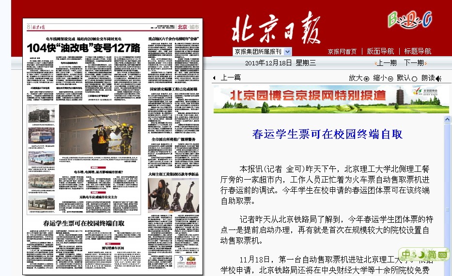 【媒體理工】多家媒體報(bào)道北理工設(shè)置北京首臺(tái)學(xué)生火車票自助終端