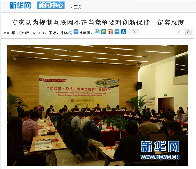 12月15日,由北京大學(xué)競爭法研究中心主辦的第17期“競爭法論壇”――“互聯(lián)網(wǎng)•價格•競爭法規(guī)制”高端論壇在北京大學(xué)法學(xué)院舉行。這場論壇的主旨是探討如何界定互聯(lián)網(wǎng)產(chǎn)業(yè)的相關(guān)市場、如何規(guī)制互聯(lián)網(wǎng)領(lǐng)域的壟斷行為及不正當(dāng)競爭行為等。董昀攝