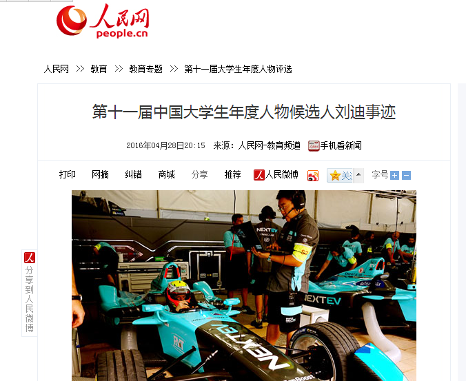 2015年6月28日,中國(guó)國(guó)歌在國(guó)際汽聯(lián)的頂級(jí)賽事——電動(dòng)方程式世界錦標(biāo)賽的倫敦收官戰(zhàn)頒獎(jiǎng)禮上響起,中國(guó)國(guó)家賽車(chē)隊(duì)獲得該賽事的首個(gè)年度車(chē)手總冠軍,這也是中國(guó)車(chē)隊(duì)在國(guó)際賽場(chǎng)上取得的歷史最好成績(jī)。此時(shí),25歲的劉迪作為車(chē)隊(duì)中唯一的中國(guó)工程師得到了現(xiàn)場(chǎng)觀眾及電視機(jī)前全球車(chē)迷的祝賀和贊許。