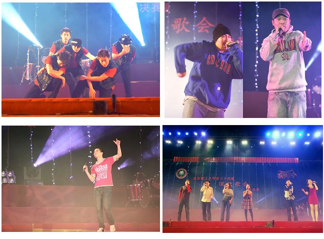 在國內新銳hip-hop組合X-power火爆的舞蹈中,比賽正式拉開了帷幕。14位選手依次演唱了自己的參賽曲目。他們的表演各具風格,從同學們喜聞樂見的POP、讓人熱血沸騰的ROCK、極具風格的JAZZ,到頗具難度的美聲和民族唱法應有盡有。充分展現了北理工學子獨特的個人風采和不俗的音樂造詣。值得一提的是,在選手表演過程中,還特意請到了往屆的一些優秀歌手為觀眾獻上他們的歌曲和祝福。校友劉燁的新歌《我的名字叫感恩》,深深地打動了現場的觀眾。由往屆深秋歌會獲獎選手組成,享譽北理的MELODY組合的深情獻唱,更是讓每位觀眾都沉浸其中。本屆歌會保留了傳統的PK環節,但又增加了新的亮點。除了6名晉級選手自由結合成三組,進行組內PK外,在第一輪PK中脫穎而出的三名選手還與往屆的優秀歌手結組對唱,進行組間PK。特邀嘉賓爽子的登場,更是掀起了歌會的高潮。