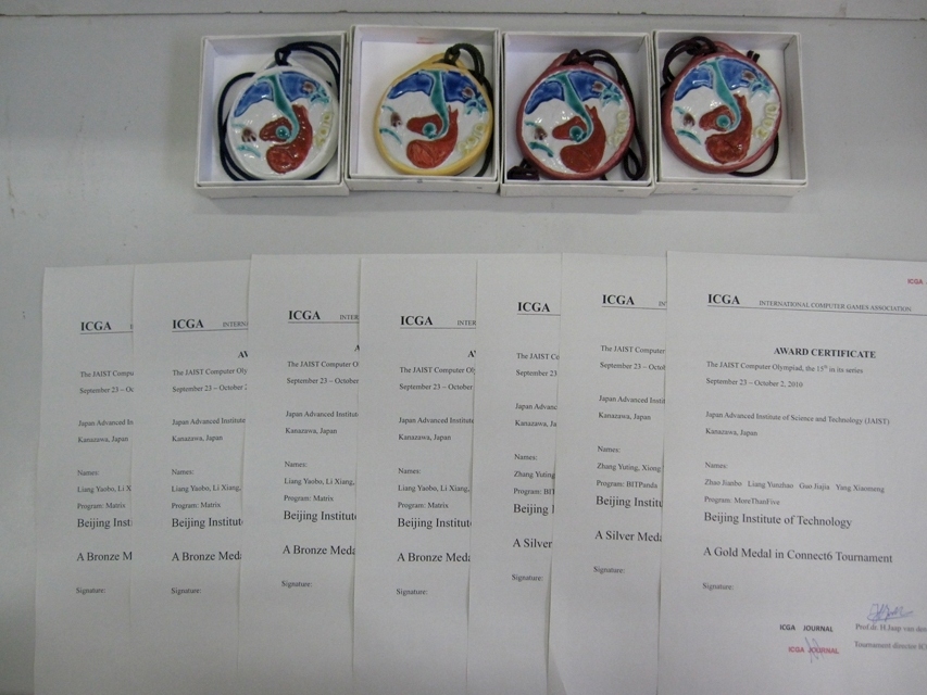 第十五屆國際計算機博弈錦標賽于2010年10月2日在日本金沢落下帷幕。北理工軟件學院本科2008級學生趙劍波、梁云昭、郭佳佳、楊曉萌等四位同學研發的六子棋項目“MoreThanFive”在該項賽事中一舉奪得金牌,另一六子棋項目組“BITconnect6”摘得銅牌。此外,在Surakarta項目中,我校派出的bitPanda競賽隊和Martix競賽隊分別奪得一銀一銅的好成績。北理工軟件學子又一次在國際舞臺上為母校增添光彩,為祖國爭得榮譽!