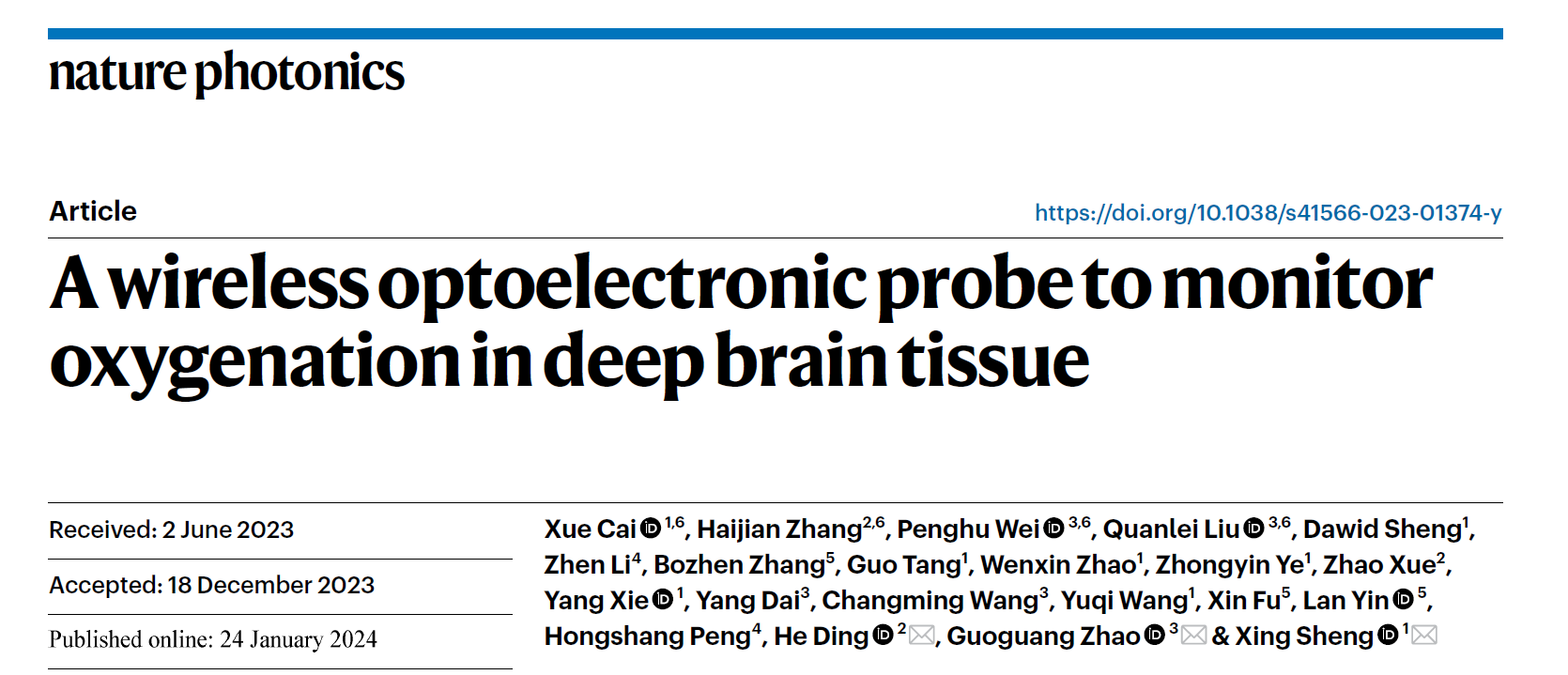 近日,北京理工大學(xué)光電學(xué)院王涌天、楊健教授團(tuán)隊(duì)成員丁賀副教授、首都醫(yī)科大學(xué)宣武醫(yī)院趙國(guó)光教授和清華大學(xué)盛興副教授共同合作,開(kāi)發(fā)了一種植入式微型光電探針系統(tǒng),可在自由活動(dòng)的動(dòng)物深層腦組織中無(wú)線、連續(xù)、實(shí)時(shí)監(jiān)測(cè)腦組織氧分壓,并揭示了癲癇狀態(tài)下動(dòng)物腦內(nèi)神經(jīng)活動(dòng)與局部氧代謝的耦合規(guī)律。研究成果以《Wireless Optoelectronic Probe to Monitor Tissue Oxygenation in Deep Brain Tissue》為題發(fā)表在Nature Photonics期刊上。