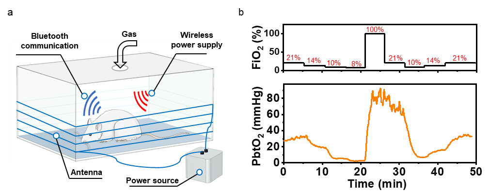圖3(a)采用線圈設(shè)計(jì)的磁共振無(wú)線供電方式,驅(qū)動(dòng)全植入小鼠腦內(nèi)的傳感電路系統(tǒng),(b)記錄在不同氧含量環(huán)境中動(dòng)物腦組織氧分壓的變化過(guò)程。