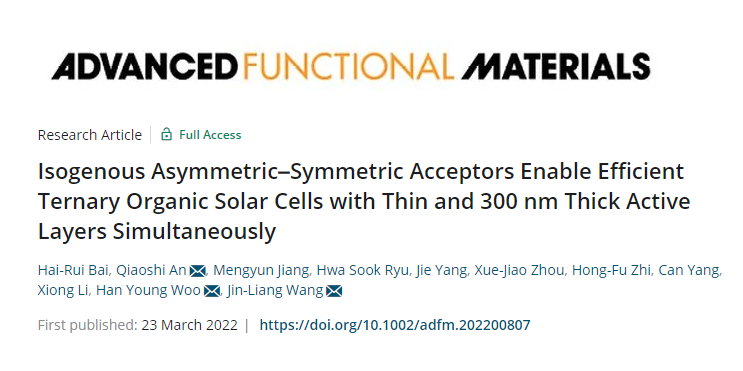 近日,北理工王金亮教授團(tuán)隊(duì)在構(gòu)筑高效三元有機(jī)太陽能電池方面取得進(jìn)展,相關(guān)研究成果發(fā)表于國際材料領(lǐng)域著名學(xué)術(shù)期刊《Advanced Functional Materials》上,題為“Isogenous Asymmetric-Symmetric Acceptors Enable Efficient Ternary Organic Solar Cells with Thin and 300 nm Thick Active Layers Simultaneously”。化學(xué)與化工學(xué)院博士研究生白海瑞為論文第一作者,王金亮教授、安橋石特別研究員以及Han Young Woo教授(韓國高麗大學(xué))為通訊作者,北京理工大學(xué)為第一通訊單位。論文的合作者還包括北京工商大學(xué)李熊教授。