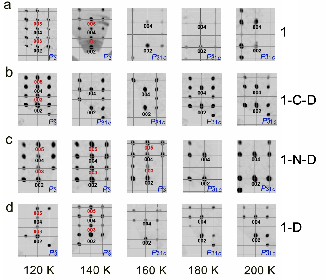 自1931年發現氘同位素以來,氘代被廣泛用于調控材料的化學和物理性質。1942年,研究者發現氘代KH2PO4(KDP)后材料的鐵電相變溫度提高107 K,隨后氘代被進一步研究應用于調控材料的導電、磁性、熒光性質等。在目前已知的研究體系中,顯著的氘代效應發生在伴隨質子轉移的強氫鍵結構中,而對于更為普遍的弱氫鍵體系,氘代效應并不明顯,這個問題極大的限制了氘代在物性調控方面的進一步應用。