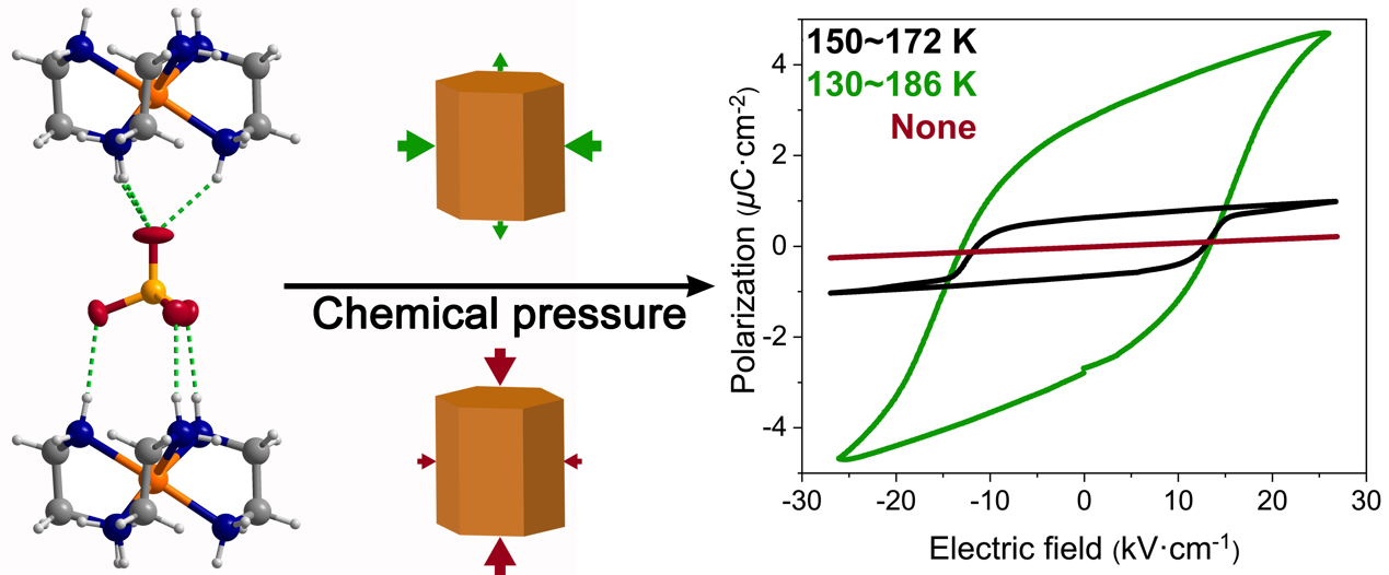 該研究團隊在前期通過結構變化調控材料物理性質的研究基礎( Nat. C hem., 2014 , 6, 1079-1083 ; Nat. Commun. 2019, 10 , 4805; CCS Chem. 2021, 2, 2464–2472; Nat. Commun. 2021, 12 , 6908; Angew. Chem. Int. Ed. 2023, 62, e202217977; J. Am. Chem. Soc. 2023, 145, 5545-5552),針對單晶晶格各向異性的結構特征,提出選擇性氘代引入各向異性化學壓力的研究思路,通過對具有三方晶系的硫酸三乙二胺合鈷鐵電化合物進行選擇性氘代,在弱氫鍵功能材料中實現了顯著的氘代效應。當對C-H原子氘代時鐵電窗口溫度從22 K提高到了56 K,自發極化值也增大4倍,而當對N-H原子氘代時,鐵電性質完全消失。通過變溫晶胞參數、倒異空間分析、介電溫譜、電滯回線、以及理論計算等對該現象進行了深入的研究。