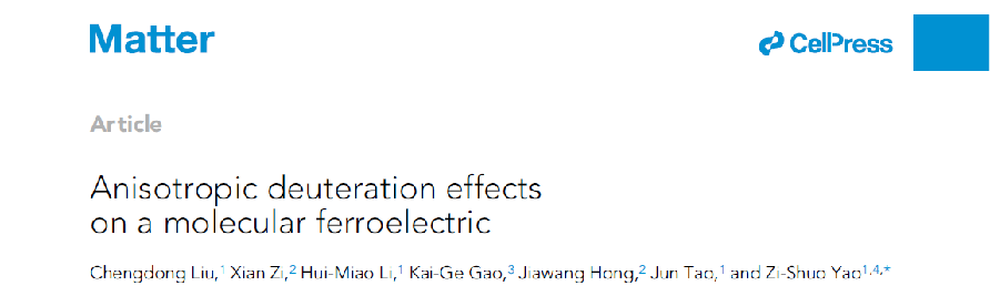 近日,北京理工大學化學與化工學院姚子碩研究員在國際頂級期刊《Matter》發表題為“Anisotropic deuteration effects on a molecular ferroelectric”的研究論文。北京理工大學為唯一通訊作者單位,文章實驗部分主要由北京理工大學研究生柳承東和李慧苗完成,北京理工大學宇航學院洪家旺教授在計算方面提供了幫助,姚子碩研究員為文章通訊作者。