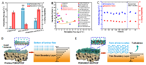 圖5. 膜PV性能以及膜表面形態(tài)對(duì)進(jìn)料液流動(dòng)行為的影響:(A)40 oC下分離5 wt%乙醇水溶液膜的PV性能;(B)PV分離性能對(duì)比;(C)膜長(zhǎng)時(shí)穩(wěn)定性;(D-E)膜表面的流動(dòng)行為。