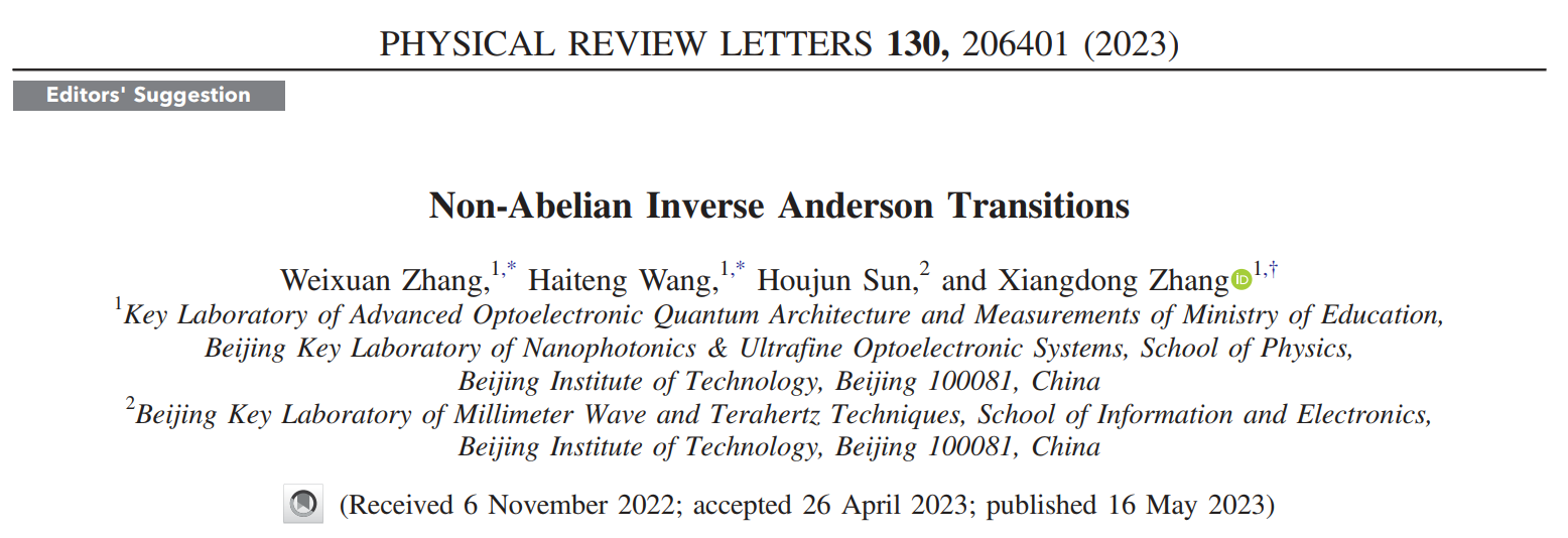 日前,北京理工大學物理學院張向東教授課題組和集成電路與電子學院孫厚軍教授課題組開展合作,在拓撲電路和非阿貝爾逆安德森相變研究方面取得重要進展。相關工作發表在Physical Review Letters上 (Phys. Rev. Lett. 130, 206401 (2023)),并獲得編輯推薦(Editors' Suggestion)。研究工作得到了國家自然科學基金委和國家重點研發計劃的資助。北京理工大學物理學院張蔚暄研究員和碩士研究生王海藤為論文的共同第一作者,張向東教授      為通訊作者。