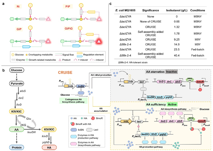 合成生物學(xué)通過設(shè)計(jì)代謝途徑,能夠?qū)⒘畠r(jià)的原料通過微生物細(xì)胞轉(zhuǎn)化為重要的高附加值化合物,實(shí)現(xiàn)低成本的綠色生物合成。傳統(tǒng)的代謝工程改造提高目標(biāo)產(chǎn)物產(chǎn)量的方式包括途徑基因的過表達(dá)、敲除或抑制等,然而這種策略往往會(huì)造成細(xì)胞的代謝失衡、有毒中間產(chǎn)物堆積以及生長受損等現(xiàn)象。動(dòng)態(tài)調(diào)控可以通過構(gòu)建響應(yīng)特定信號分子的基因回路,在恰當(dāng)?shù)墓?jié)點(diǎn)調(diào)節(jié)基因表達(dá)水平,從而實(shí)現(xiàn)對目標(biāo)途徑的代謝調(diào)控。基于此,團(tuán)隊(duì)在大腸桿菌中建立了響應(yīng)胞內(nèi)關(guān)鍵代謝物濃度的動(dòng)態(tài)調(diào)控系統(tǒng),形成一種 “生長驅(qū)動(dòng)生產(chǎn),生產(chǎn)驅(qū)動(dòng)再生長,再生長驅(qū)動(dòng)再生產(chǎn)”的循環(huán)調(diào)控模式。通過偶聯(lián)響應(yīng)氨基酸的 ivbL 轉(zhuǎn)錄衰減元件以及響應(yīng)高級醇的BmoR轉(zhuǎn)錄激活元件,實(shí)現(xiàn)生長相關(guān)前體物的持續(xù)供應(yīng)以及高級醇的持續(xù)高水平生產(chǎn)(圖1)。